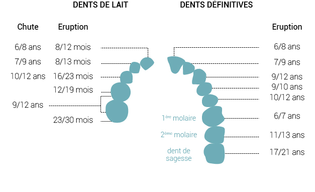 Entre 3 et 12 ans, les dents de lait tombent petit à petit pour laisser place aux nouvelles dents, définitives cette fois. A l’âge de 12 ans, les dernières dents de lait finissent de tomber, et c’est environ à l’âge de 21 ans que les dernières dents adultes apparaitront : les dents de sagesse.